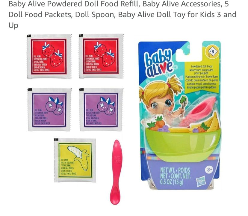 •5 POWDERED DOLL FOOD PACKETS: This Powdered Doll Food refill toy includes 5 packets to mix with water and feed Baby Alive dolls that eat powdered doll food. (Dolls sold separately.)