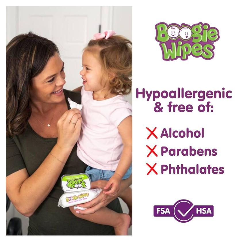 •BABY WIPES: Boogie Wipes are wet wipes for baby and kids that are made with natural saline, which is gentle on skin, helps clean and dissolve snot and boogers, and wipes away dirt and germs They’re gentle enough to be used on noses, faces, fingers and toes whenever cleaning is necessary.