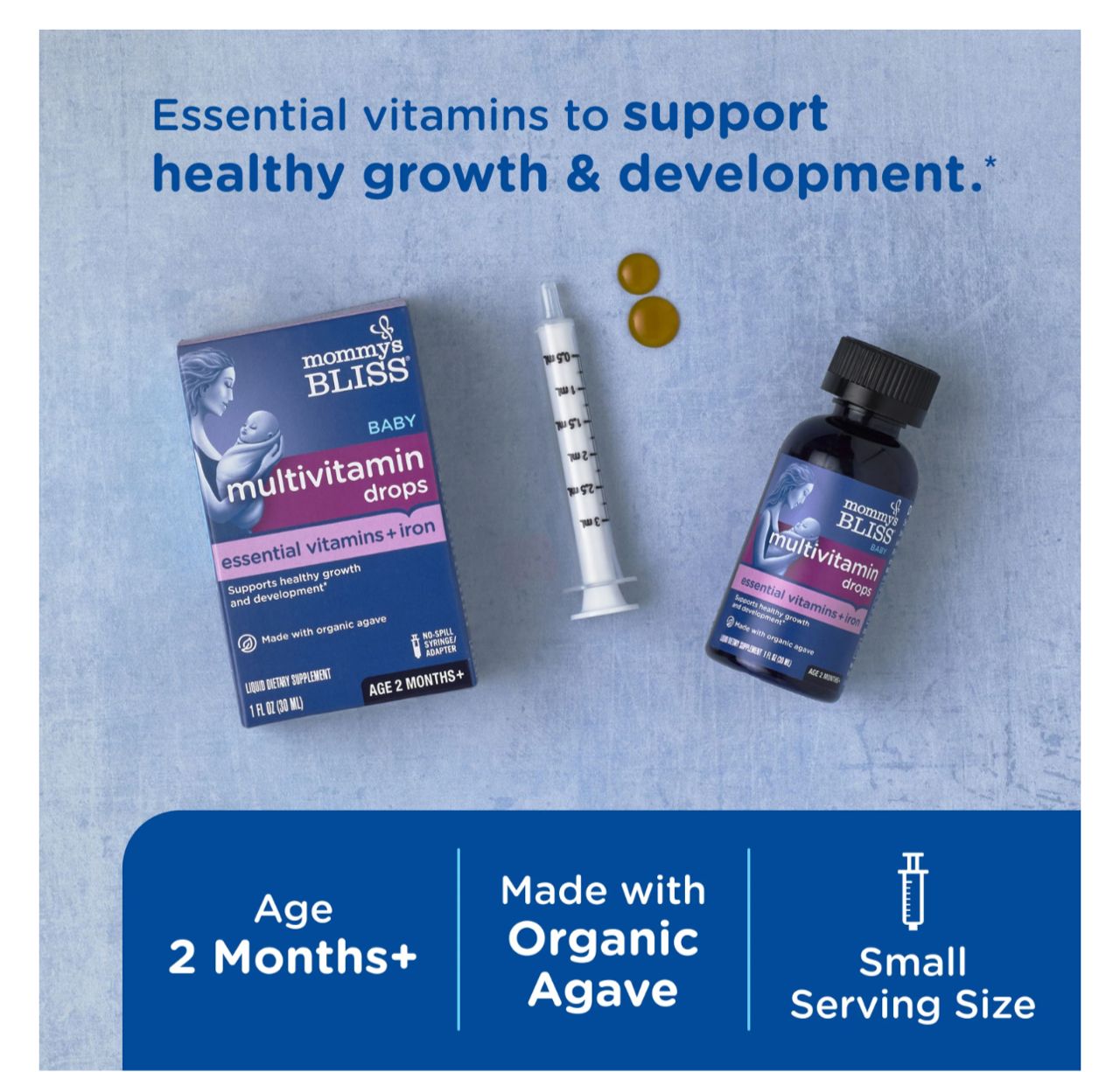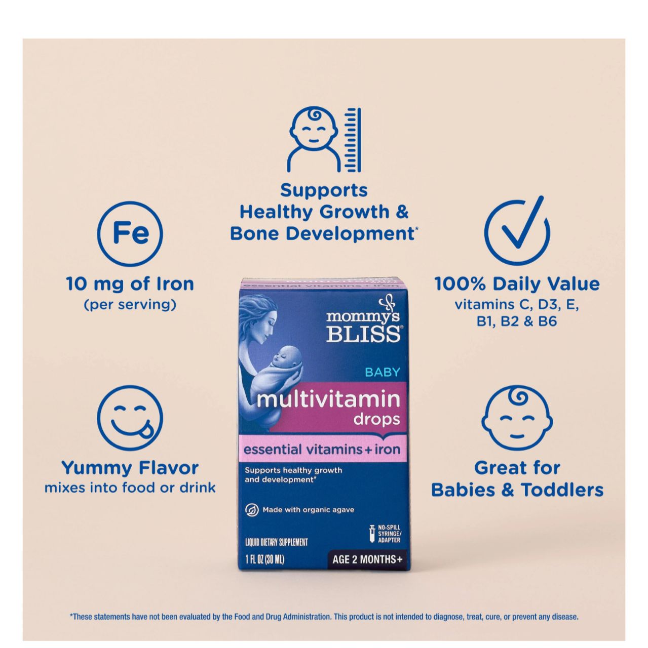 Mommy’s Bliss Baby Multivitamin + Iron provides essential vitamins to support healthy growth & bone development.