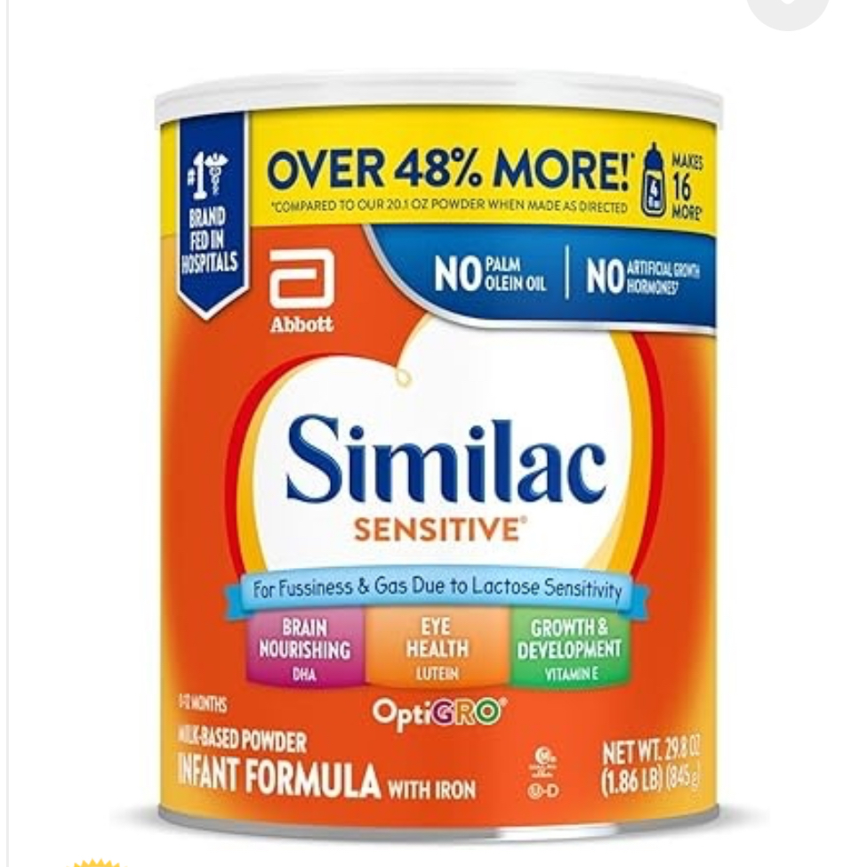 Similac Sensitive* is an easy-to-digest, milk-based infant formula designed for sensitive tummies. It’s complete nutrition to ease fussiness,† gas,† or mild spit-up. Our formula has our exclusive blend of ingredients to help support baby’s brain and eye development. Similac was the first leading infant formula brand with no artificial growth hormones and is the #1 infant formula brand fed in hospitals.